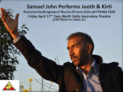 29 ਮਾਰਚ, 2015 ਨੂੰ ਟਰਾਂਟੋ ਵਿਖੇ ਨਾਟਕ ‘ਜੂਠ’ ਦੌਰਾਨ ਸੈਮੂਅਲ ਜੌਹਨ- ਫੋਟੋ ਪ੍ਰਤੀਕ